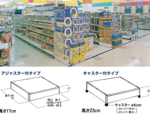 で、「ステージ」という什器(下画像参照。季節売り場などを展開するときの土台にする、木製やスチール製の平べったいものです。結構重い。)を2枚まとめて担ぎ上げ、自分の身長より高い場所に核の言うしようとしていました。