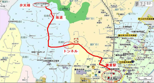 ルートに沿ってトンネル、坂道のふもと、銭洗弁財天と続きます。