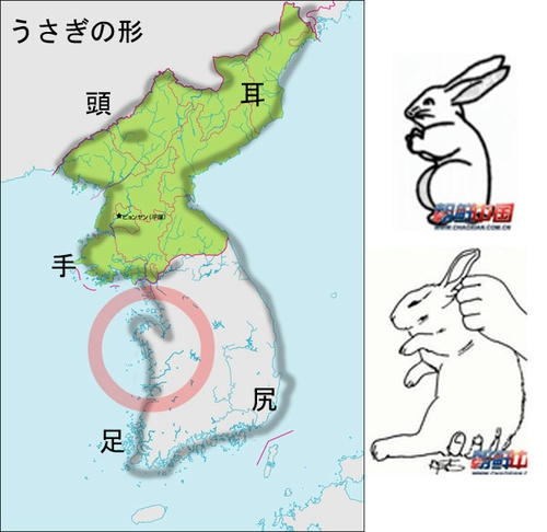 中国のインターネット上で4日、地図で見た朝鮮半島が「人に首筋を捕えられたウサギ」に似ていると主張するイラストが登場し、韓国で反発が高まった。