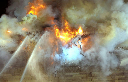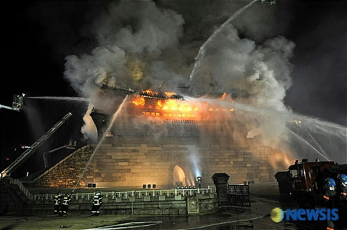 【ソウル11日聯合】旧正月連休最終日となる10日夜、国宝第1号に指定されている崇礼門(南大門)が、放火によるものとみられる火災で全焼・崩壊した。消防当局は5時間以上にわたる消火作業にもかかわらず崩壊を防ぐことができず、また放火の容疑者に対する警察の捜査も難航している。